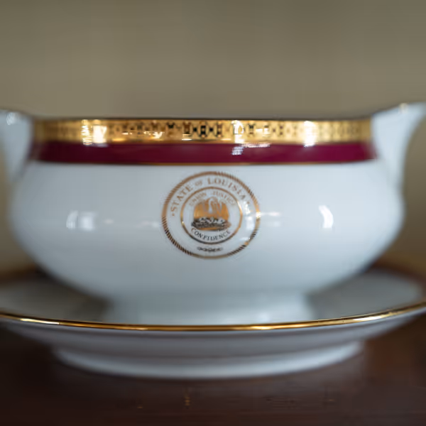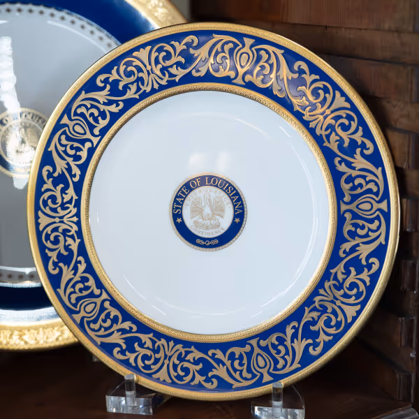 The Mansion’s elegant marble floor features a central motif made of approximately 2,500 pieces of marble showcasing the state seal, with a magnolia blossom prominently at its base. Though beautiful, the official Louisiana state seal does not feature a magnolia at its base; the designer exercised artistic license by incorporating one.